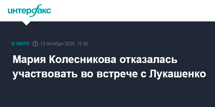Москва. 13 октября. INTERFAX.RU - Член президиума Координационного совета белорусской оппозиции Мария Колесникова отказалась участвовать во встрече арестованных оппозиционеров с президентом Александром Лукашенко 10 октября. Об этом сообщил телеграм-канал штаба Виктора Бабарико. Колесникова ранее была координатором штаба.
