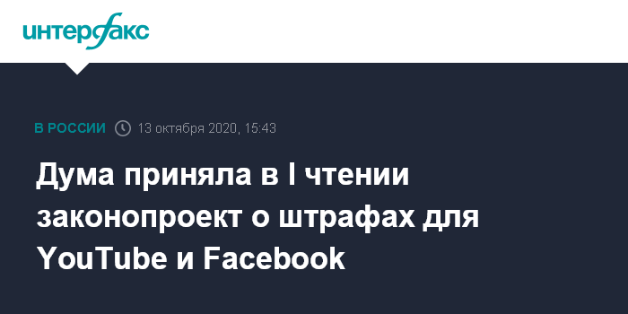 Дума приняла в I чтении законопроект о штрафах для YouTube и Facebook