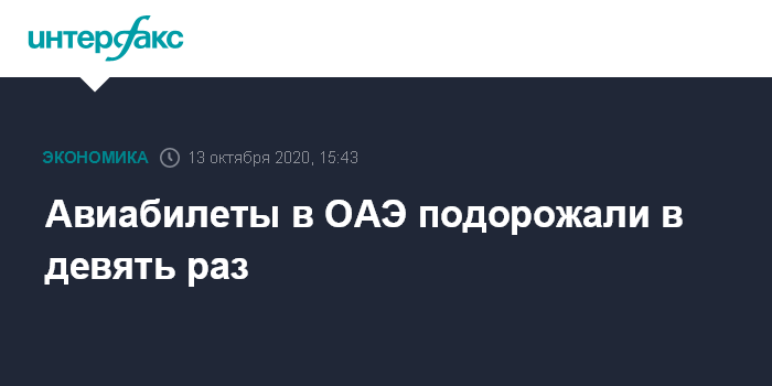 Москва. 13 октября. INTERFAX.RU - Авиабилеты из России в Объединенные Арабские эмираты подорожали в девять раз, теперь они недоступны среднему классу, заявила пресс-секретарь Российского союза туриндустрии Ирина Тюрина. Рост цен она связала с высоким спросом и искусственным ограничением числа рейсов.