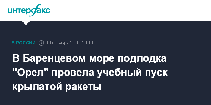 Москва. 13 октября. INTERFAX.RU - Атомная подлодка "Орёл" во вторник осуществила успешный учебный пуск противокорабельной крылатой ракетой в Баренцевом море, сообщила пресс-служба Северного флота РФ.