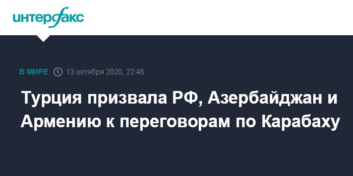 Москва. 13 октября. INTERFAX.RU - Турция предлагает провести четырехсторонние переговоры с участием России, Азербайджана и Армении по вопросу урегулирования конфликта в Нагорном Карабахе, сообщает турецкое телевидение.