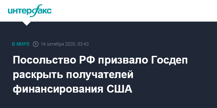 Москва. 14 октября. INTERFAX.RU - Посольство России в США призвало Госдепартамент раскрыть организации, которые получают американское финансирование.