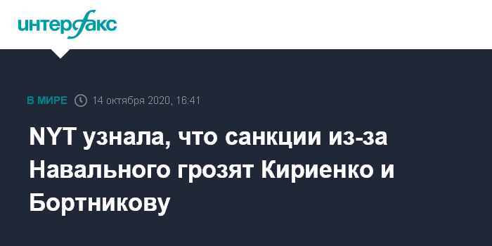 Москва. 14 октября. INTERFAX.RU - ЕС введет санкции, связанные с делом оппозиционера Алексея Навального, против шести россиян, в том числе против первого замглавы президентской администрации Сергея Кириенко, сообщает в четверг газета The New York Times со ссылкой на трех неназванных официальных лиц ЕС.