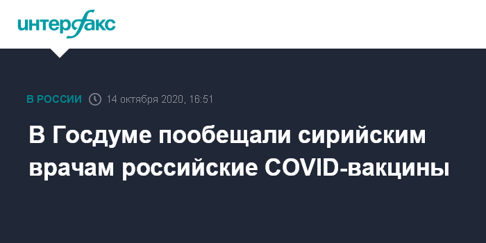 Москва. 14 октября. INTERFAX.RU - Глава комитета Госдумы по международным делам Леонид Слуцкий заявил на встрече с сирийскими врачами в Москве, что российские вакцины от COVID-19 в ближайшее время начнут поступать в Сирию.