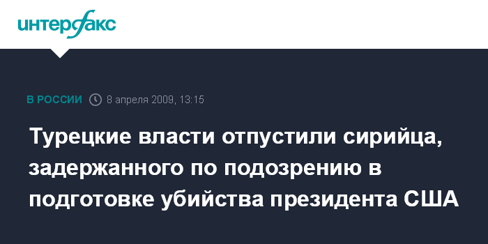 Москва. 8 апреля. INTERFAX.RU - Правоохранительные органы Турции освободили сирийца, который был арестован на минувшей неделе в связи с причастностью к возможному покушению на жизнь президента США Барака Обамы, сообщает телекомпания CNN со ссылкой на высокопоставленного американского чиновника.