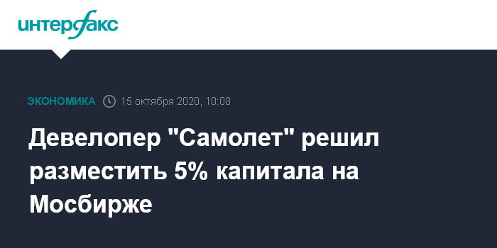 Москва. 15 октября. INTERFAX.RU - Девелопер "Самолет" официально объявил о планах провести IPO на "Московской бирже" в четвертом квартале 2020 года. Компания планирует в рамках IPO продать около 5,1% от нынешнего уставного капитала.