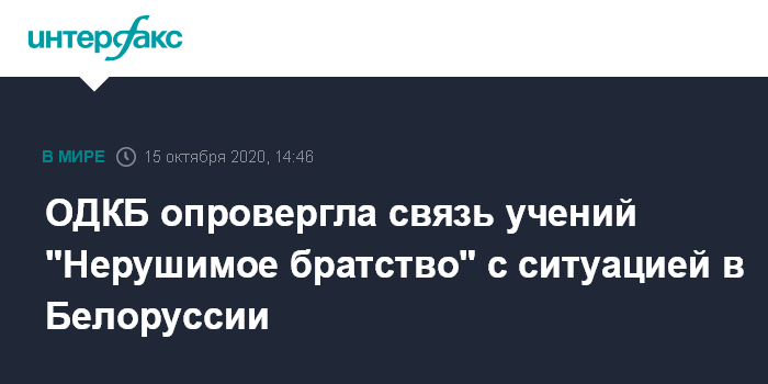 Москва. 15 октября. INTERFAX.RU - Генеральный секретарь Организации договора о коллективной безопасности (ОДКБ) Станислав Зась после встречи с президентом Белоруссии Александром Лукашенко в четверг сообщил журналистам, что проведение учения "Нерушимое братство-2020" никак не связано с ситуацией в республике.