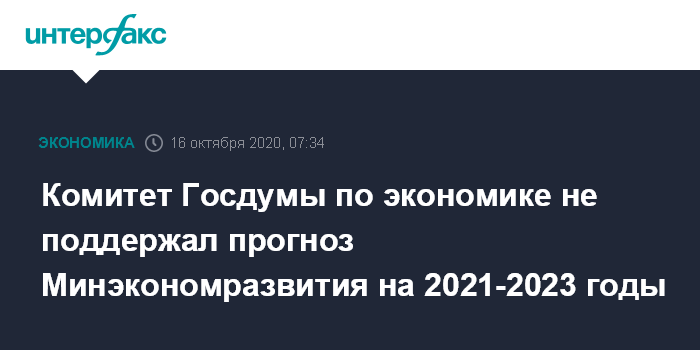 Москва. 16 октября. INTERFAX.RU - Комитет Госдумы по экономической политике выдал отрицательное заключение на разработанный и представленный в парламент Минэкономразвития прогноз социально-экономического развития РФ на 2021-2023 гг. В комитете считают, что документ не может служить базой для формирования бюджета на будущий год, так как он не учитывает уже наступившую "вторую волну" коронавируса.