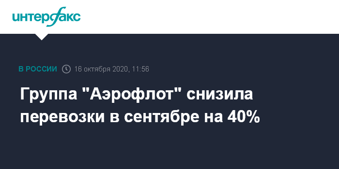 Москва. 16 октября. INTERFAX.RU - В сентябре 2020 года группа "Аэрофлот" снизила пассажиропоток в годовом измерении на 39,9%, до 3,4 млн человек, говорится в сообщении компании. В августе падение перевозок группы было на уровне 41% год к году, в июле - 55%.
