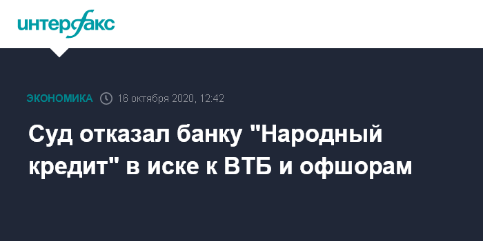 Москва. 16 октября. INTERFAX.RU -Арбитражный суд Москвы в пятницу отказал находящемуся в процедуре банкротства банку "Народный кредит" в иске к ВТБ, ООО "Региональная инвестиционная компания" (РИК) и еще трем юрлицам о выплате компенсации за неправомерно утраченную долю, следует из картотеки суда.