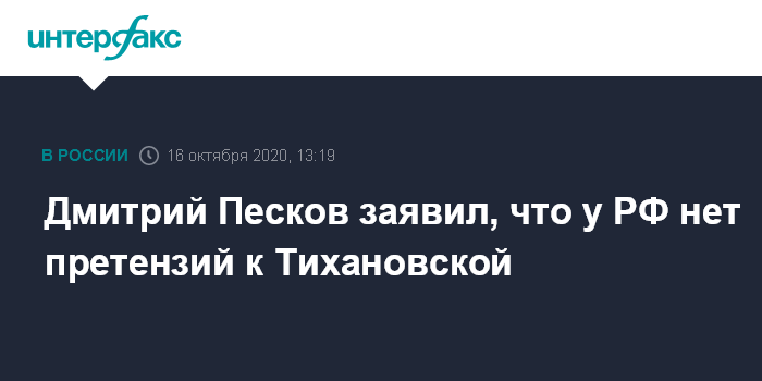 Москва. 16 октября. INTERFAX.RU - У российских правоохранительных органов нет претензий к объявленной в розыск Белоруссией экс-кандидату в президенты республики Светлане Тихановской, заявил пресс-секретарь президента РФ Дмитрий Песков.