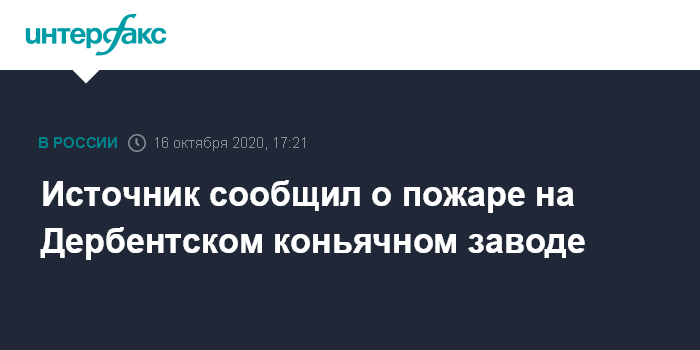 Москва. 16 октября. INTERFAX.RU - В Дербенте сотрудники МЧС получили вызов на пожар на Дербентском коньячном комбинате, сообщил информированный источник "Интерфакса".
