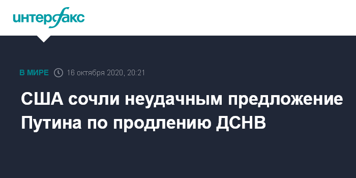 Москва. 16 октября. INTERFAX.RU - Власти США сочли неудачным предложение президента РФ Владимира Путина продлить действующий договор СНВ-3 без всяких условий на год, заявил в пятницу советник по национальной безопасности президента США Роберт О'Брайен.