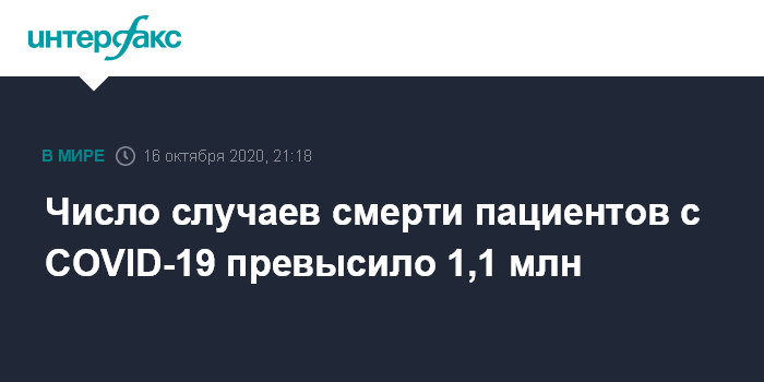 Москва. 16 октября. INTERFAX.RU - Число летальных исходов людей с коронавирусом COVID-19 в пятницу превысило отметку в 1,1 млн, свидетельствуют данные американского университета Джонса Хопкинса.