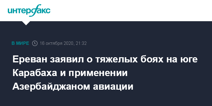 Москва. 16 октября. INTERFAX.RU - На южном направлении фронта в зоне карабахского конфликта, на границе с Ираном, продолжаются тяжелые бои, заявил представитель Минобороны Армении Арцрун Ованнисян.