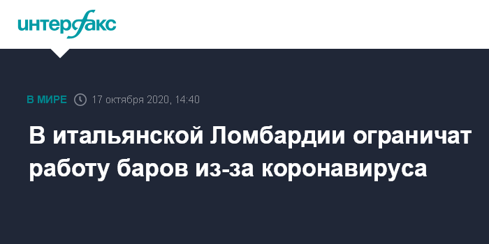 Москва. 17 октября. INTERFAX.RU - В итальянской Ломбардии, ставшей весной этого года эпицентром COVID-19 в Европе, с субботы ограничивают работу баров, чтобы не допустить второй волны коронавируса.