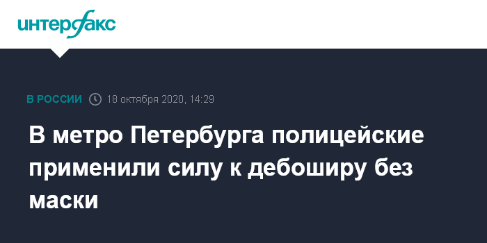 Москва. 18 октября. INTERFAX.RU - Сотрудникам полиции Петербурга пришлось применить физическую силу к мужчине, который буйно реагировал на просьбы надеть маску в метрополитене.