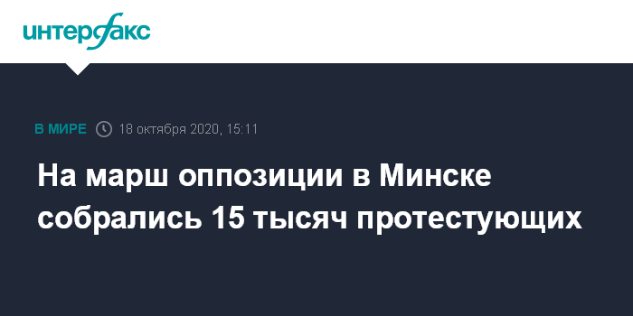 Москва. 18 октября. INTERFAX.RU - В центре Минска собралось порядка 15 тысяч участников акции оппозиции, передает корреспондент агентства "Интерфакс".