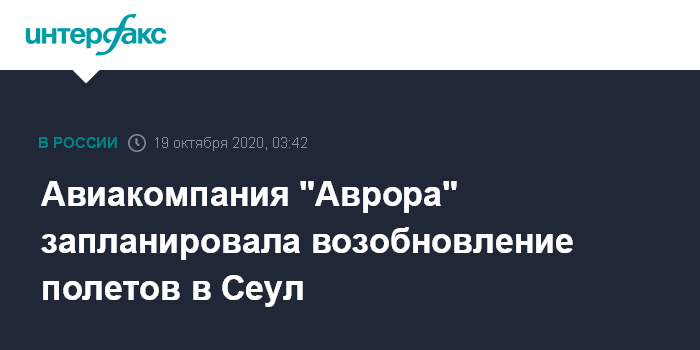 Москва. 19 октября. INTERFAX.RU - Авиакомпания "Аврора" (входит в группу "Аэрофлот") планирует с 23 октября возобновить выполнение регулярных рейсов по маршруту Владивосток-Сеул-Владивосток, прерванных из-за пандемии коронавируса, говорится сообщении авиаперевозчика.