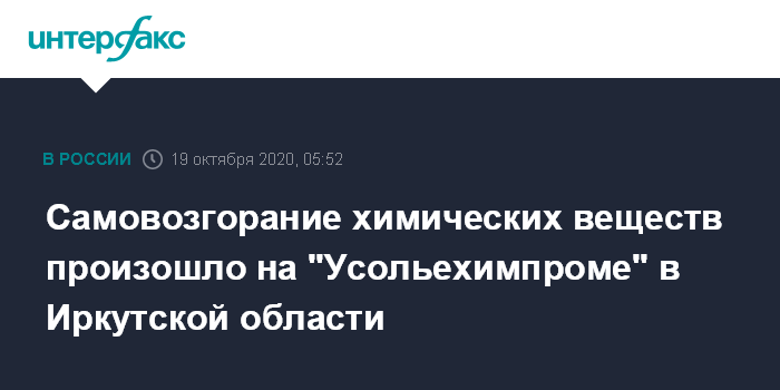 Москва. 19 октября. INTERFAX.RU - Самовозгорание химических веществ произошло на промышленной площадке "Усольехимпрома" в Иркутской области при проведении работ по ликвидации накопленного вреда, сообщает пресс-служба правительства региона.