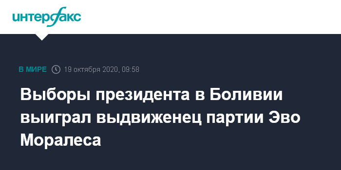 Москва. 19 октября. INTERFAX.RU - Временный президент Боливии Жанин Аньес признала победу представителя "Движения к социализму" Луиса Арсе на выборах главы государства, которые прошли в воскресенье, 18 октября.