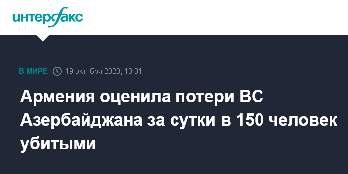 Москва. 19 октября. INTERFAX.RU - Азербайджанские военные в ходе боев в Нагорном Карабахе за минувшие сутки потеряли убитыми 150 человек, сообщает в понедельник единый информационный центр Армении.