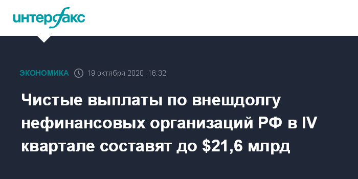 Москва. 19 октября. INTERFAX.RU - Чистые выплаты по внешнему долгу российских нефинансовых организаций, включая основной долг и проценты, в четвертом квартале 2020 года могут составить до $21,6 млрд. Это на 31% больше, чем за аналогичный период прошлого года, тогда как согласно оценкам, выполненным на основе макростатистики, они составляют $23,3 млрд, сообщается на сайте ЦБ РФ.