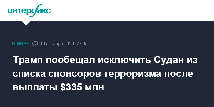 "Отличные новости! Новое правительство Судана, которое делает большие успехи, согласилось заплатить $335 млн жертвам террористических атак в США и их семьям. Как только они будут внесены, я исключу Судан из списка государств-спонсоров терроризма. Наконец-то справедливость для американского народа и большой шаг для Судана!", - написал Трамп в твиттере.