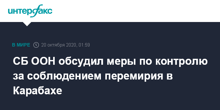 Москва. 20 октября. INTERFAX.RU - Постпред РФ при ООН Василий Небензя заявил, что в Совете Безопасности обсуждают, как эффективнее контролировать соблюдение режима прекращения огня в Нагорном Карабахе, договоренность о котором была достигнута, но не соблюдается.