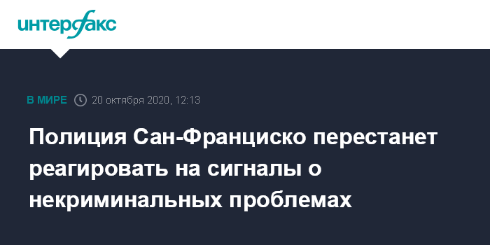 Москва. 20 октября. INTERFAX.RU - В полиции Сан-Франциско со следующего месяца полицейские перестанут реагировать на сигналы о ненасильственных проблемах, связанных с отклонениями поведения у людей с социальными, поведенческими или психическими проблемами, сообщила радиостанция NPR.