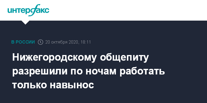 Москва. 20 октября. INTERFAX.RU - Губернатор Нижегородской области Глеб Никитин сообщил, что запретил кафе и ресторанам принимать посетителей по ночам, теперь с полуночи до 6 утра они могут работать только навынос.