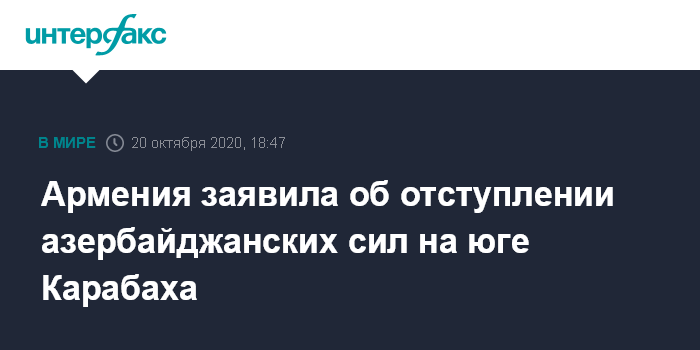 Москва. 20 октября. INTERFAX.RU - Вооруженные силы Азербайджана отступают с территории Худаферинского водохранилища на юге Карабаха вблизи границы с Ираном, заявила пресс-секретарь Минобороны Армении Шушан Степанян во вторник на своей странице в фейсбуке.
