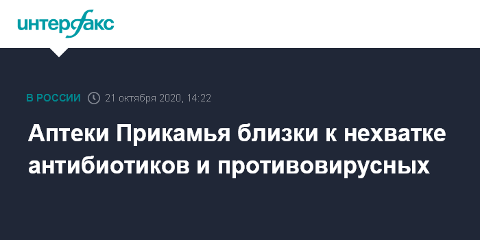 Москва. 21 октября. INTERFAX.RU - Аптечные сети Пермского края фиксируют недостаточные запасы антибиотиков и противовирусных средств на фоне повышенного спроса и увеличения числа новых случаев заражения ОРВИ и коронавирусом в регионе, сообщается в среду на сайте администрации губернатора и правительства края.