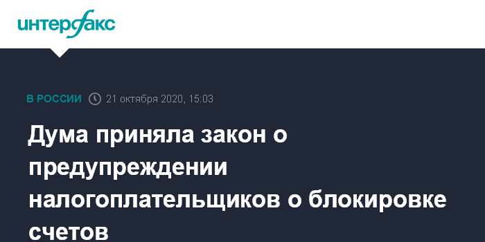 Москва. 21 октября. INTERFAX.RU - Госдума приняла в третьем чтении поправки в Налоговый кодекс (НК) о праве Федеральной налоговой службы за 14 дней информировать налогоплательщиков, налоговых агентов и плательщиков страховых взносов о предстоящей блокировке банковских счетов.