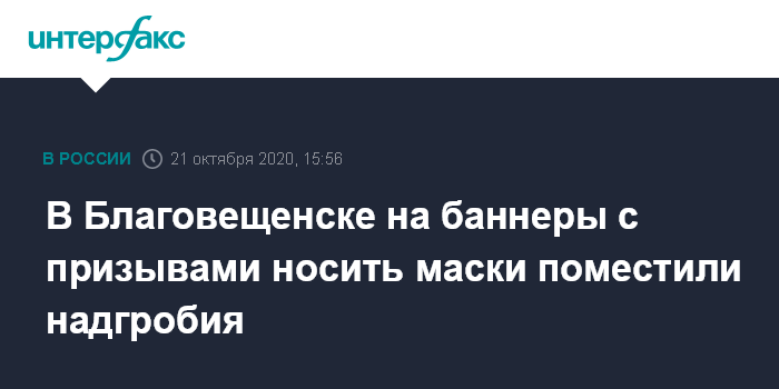 Москва. 21 октября. INTERFAX.RU - Жители Благовещенска активно обсуждают в соцсетях появившиеся в городе рекламные щиты, на которых авторы рядом с призывами в обязательном порядке носить медицинские маски разместили надгробия.