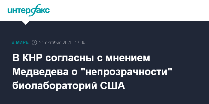 Москва. 21 октября. INTERFAX.RU - В Китае согласны с заместителем председателя Совбеза РФ Дмитрием Медведевым в том, что деятельность американских биолабораторий на постсоветском пространстве и во всем мире является "непрозрачной", заявил на брифинге представитель МИД КНР Чжао Лицзянь.