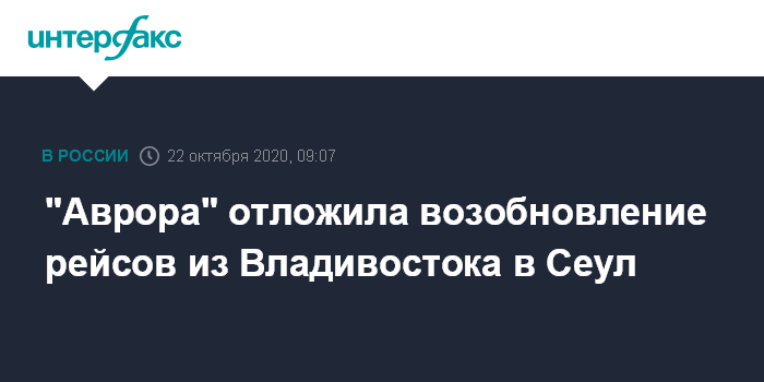 Москва. 22 октября. INTERFAX.RU - Авиакомпания "Аврора" (входит в группу "Аэрофлот") сообщила, что отложила возобновление регулярных полетов по маршруту Владивосток - Сеул - Владивосток. Ранее она планировала их возобновить с 23 октября.