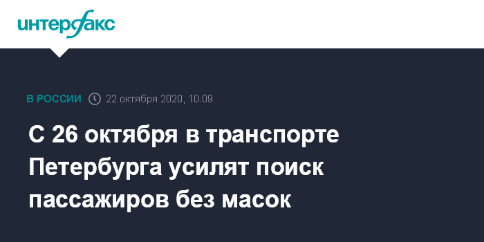 Москва. 22 октября. INTERFAX.RU - Власти Санкт-Петербурга предупреждают, что с 26 октября в общественном транспорте будет усилена работа по выявлению нарушителей масочного режима.