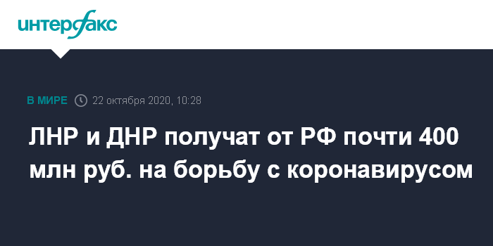 Москва. 22 октября. INTERFAX.RU - Самопровозглашенные Донецкая и Луганская народные республики получат от России медицинскую помощь для сдерживания коронавирусной инфекции на сумму почти в 400 млн рублей.