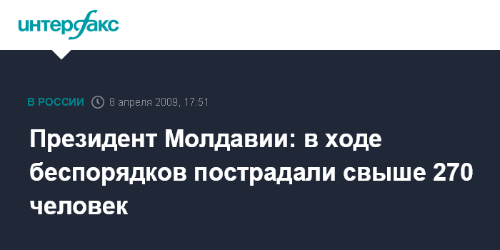 Москва. 8 апреля. INTERFAX.RU - Число пострадавших в ходе беспорядков, происшедших в Кишиневе в минувший вторник, составило более 270 человек, заявил президент Молдавии Владимир Воронин в среду на заседании правительства.