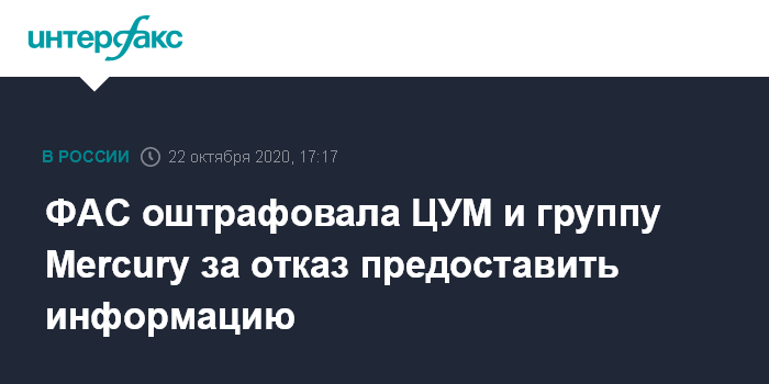 Москва. 22 октября. INTERFAX.RU - ФАС оштрафовала ЦУМ, а также ООО "Мэркури Классик", ООО "Мэркури Элит", ООО "Турбийон Холдинг" за отказ предоставить информацию по мотивированному требованию антимонопольного органа, говорится в пресс-релизе службы.