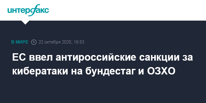 Москва. 22 октября. INTERFAX.RU - Совет ЕС принял санкции против двух физических лиц и специального центра ГРУ за кибератаки на германский бундестаг и Организацию по запрещению химического оружия (ОЗХО), постановление опубликовано в четверг в "Официальном журнале" Евросоюза.