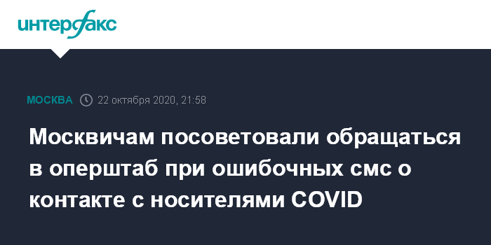 Москва. 22 октября. INTERFAX.RU - Москвичи, получившие по ошибке смс-сообщения о контакте с инфицированным или заболевании COVID-19, могут обратиться на "горячую линию" столичного оперштаба по контролю ситуации с коронавирусной инфекцией.