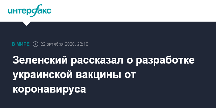 Москва. 22 октября. INTERFAX.RU - Украина разрабатывает свою вакцину от коронавируса, но спешить с получением результатов не будет и собирается использовать ее в дополнение к импортным вакцинам, сообщил президент Украины Владимир Зеленский.