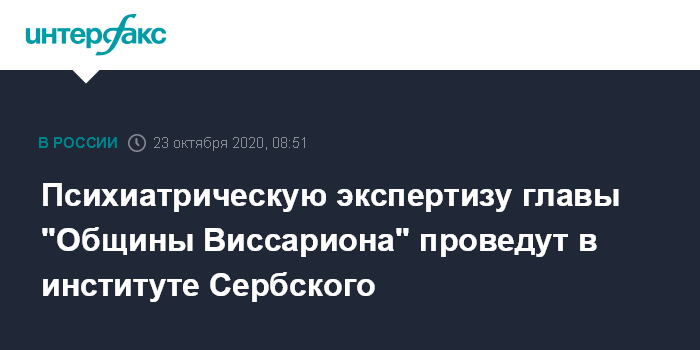 Москва. 23 октября. INTERFAX.RU - Адвокаты обвиняемых по делу "Церкви последнего завета" сообщают, что главу общины Сергея Торопа (Виссариона) перевели в институт имени Сербского.
