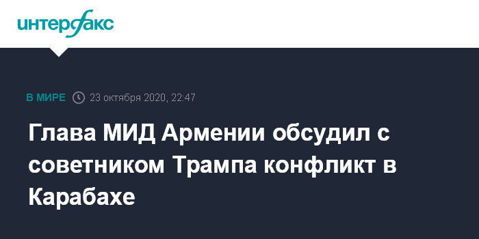 Москва. 23 октября. INTERFAX.RU - Глава МИД Армении Зограб Мнацаканян и советник президента США по вопросам национальной безопасности Роберт О`Брайан на встрече в Вашингтоне в пятницу заявили о необходимости прекращения огня в зоне карабахского конфликта.