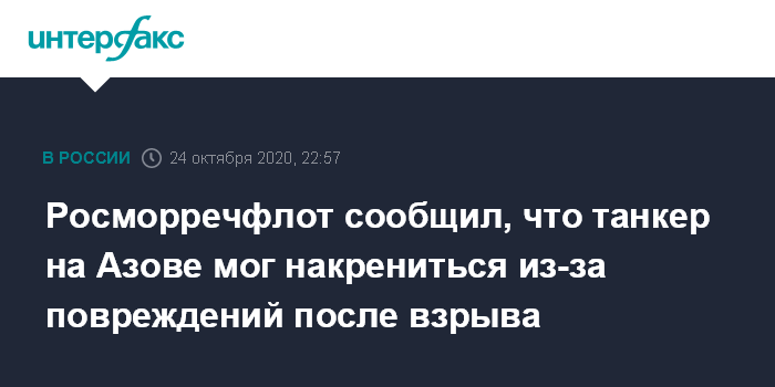 Москва. 24 октября. INTERFAX.RU - Нефтяной танкер "Генерал Ази Асланов", на борту которого произошел взрыв, получил значительные повреждения выше ватерлинии, видимых поступлений воды на борт нет, сообщил "Интерфаксу" представитель Росморречфлота в субботу.