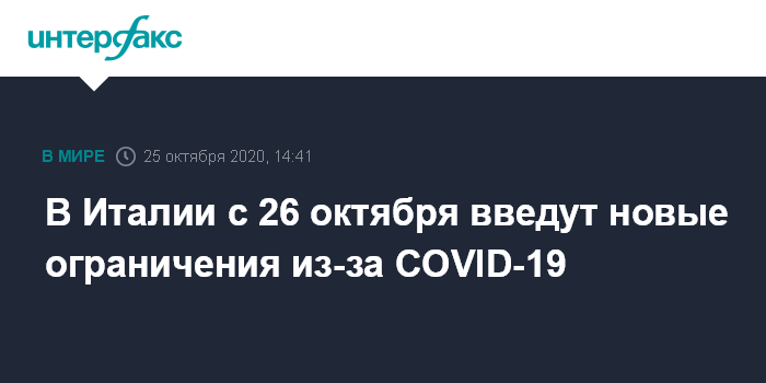 Москва. 25 октября. INTERFAX.RU - В Италии с понедельника ужесточаются ограничения в связи с ухудшением эпидемиологической ситуации.