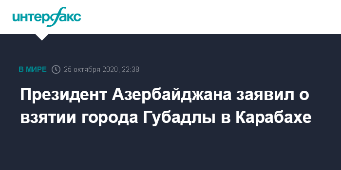 Москва. 25 октября. INTERFAX.RU - Президент Азербайджана Ильхам Алиев в воскресенье заявил о взятии под контроль ряда сел Зангиланского, Джебраильского и Губадлинского районов, а также города Губадлы.