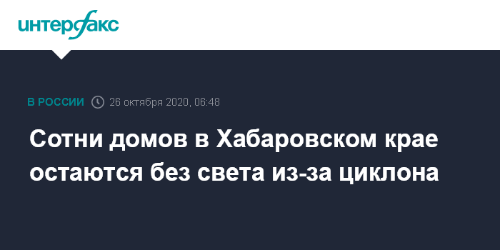 Москва. 26 октября. INTERFAX.RU - После прошедшего в выходные в Хабаровском крае циклона без электричества остаются более 800 жилых домов и десять социально значимых объектов в 11 населенных пунктах региона, сообщается на сайте краевого правительства.